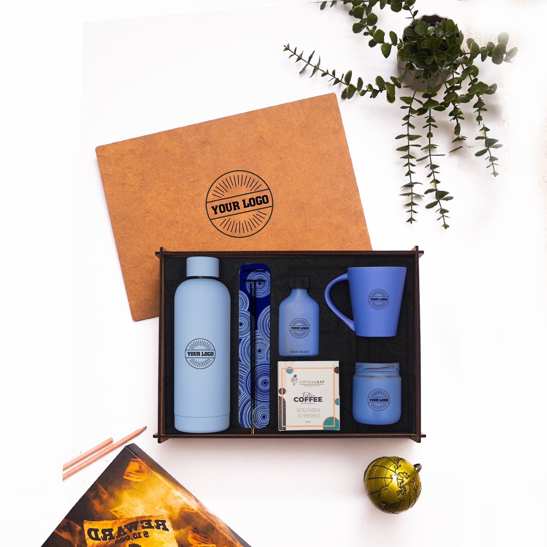 36 x 26 cm kişiselleştirilebilir kapaklı MDF ahşap kutu zarif ve uzun ömürlü bir sunum sağlarken set içeriğinde bulunan 100 ml Türk kahvesi fincanı şık bir kahve deneyimi sunar kişiselleştirilebilir 220 ml latte kupa günlük kullanımda ideal bir içim sağlar Candleaf kokulu cam mum ortama sıcak ve hoş bir atmosfer katar Freshleaf 50 ml cam kolonya ferahlatıcı bir dokunuş sunarken 450 ml kişiselleştirilebilir çelik termos sıcak-soğuk içecekleri taşımada pratiklik sağlar Coffeleaf kutulu filtre kahve 50 gr seti tamamlayan keyifli bir aroma sunar tüm ürünlerde UV baskı ile marka görünürlüğü net ve profesyonel şekilde öne çıkar