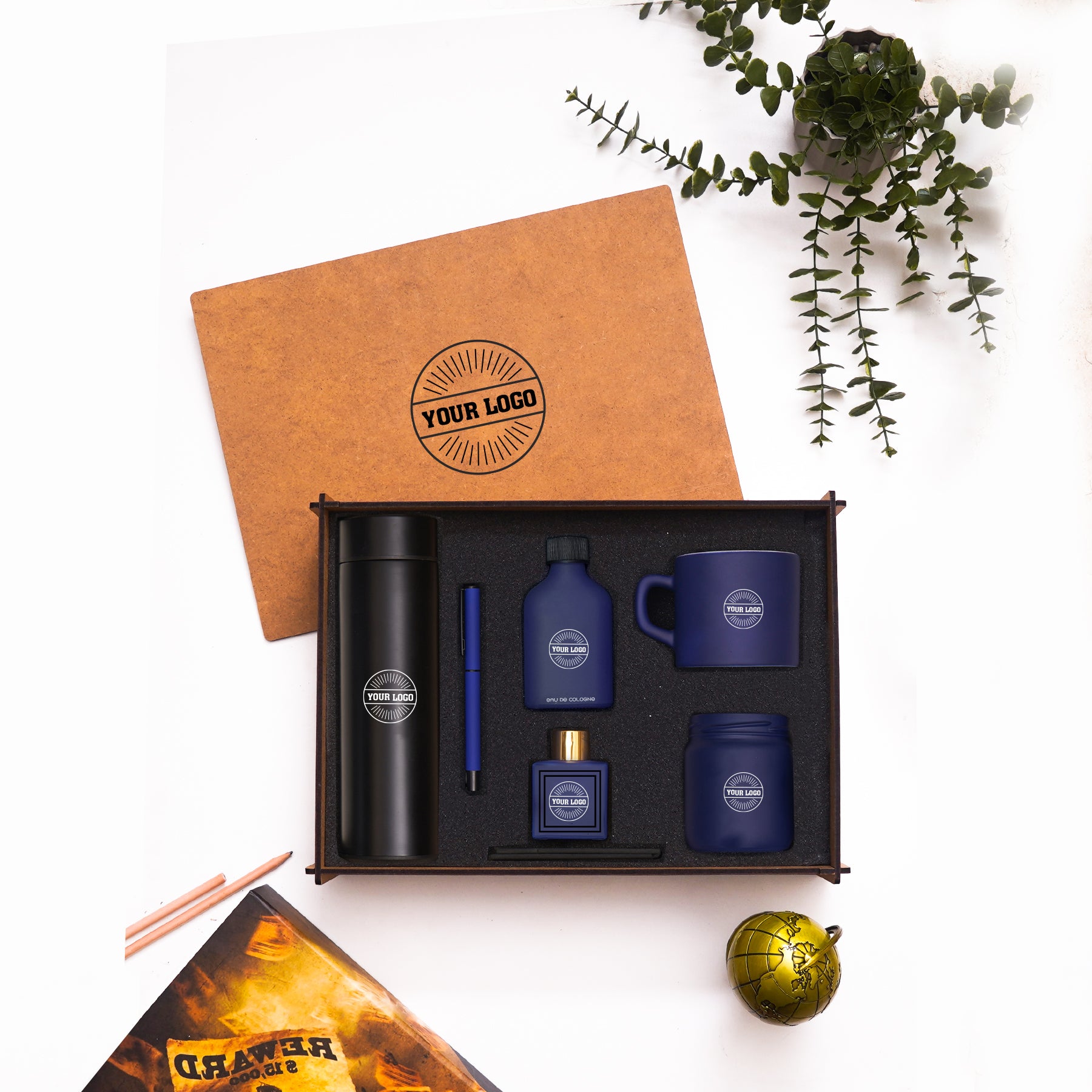 Kişiselleştirilebilir kapaklı dekoratif MDF ahşap kutu uzun ömürlü yapısı ve şık görünümüyle özel hediye sunumları için ideal bir seçenektir set içerisinde yer alan 450 ml kişiselleştirilebilir çelik termos günlük sıcak ve soğuk içim konforu sağlar Freshleaf 50 ml cam kolonya ferahlatıcı dokusuyla seti zenginleştirir 220 ml kişiselleştirilebilir çay ve nescafe fincanı hem ofis hem ev kullanımı için pratik bir içecek deneyimi sunar Candleaf kokulu cam mum bulunduğu ortama sıcak bir ambiyans katar kişiselleştirilebilir 50 ml ortam kokusu mekana hoş bir esans bırakırken mavi yazan tükenmez kalem setin fonksiyonel tamamlayıcısı olur tüm kişiselleştirilebilir yüzeyler UV baskıya uygundur