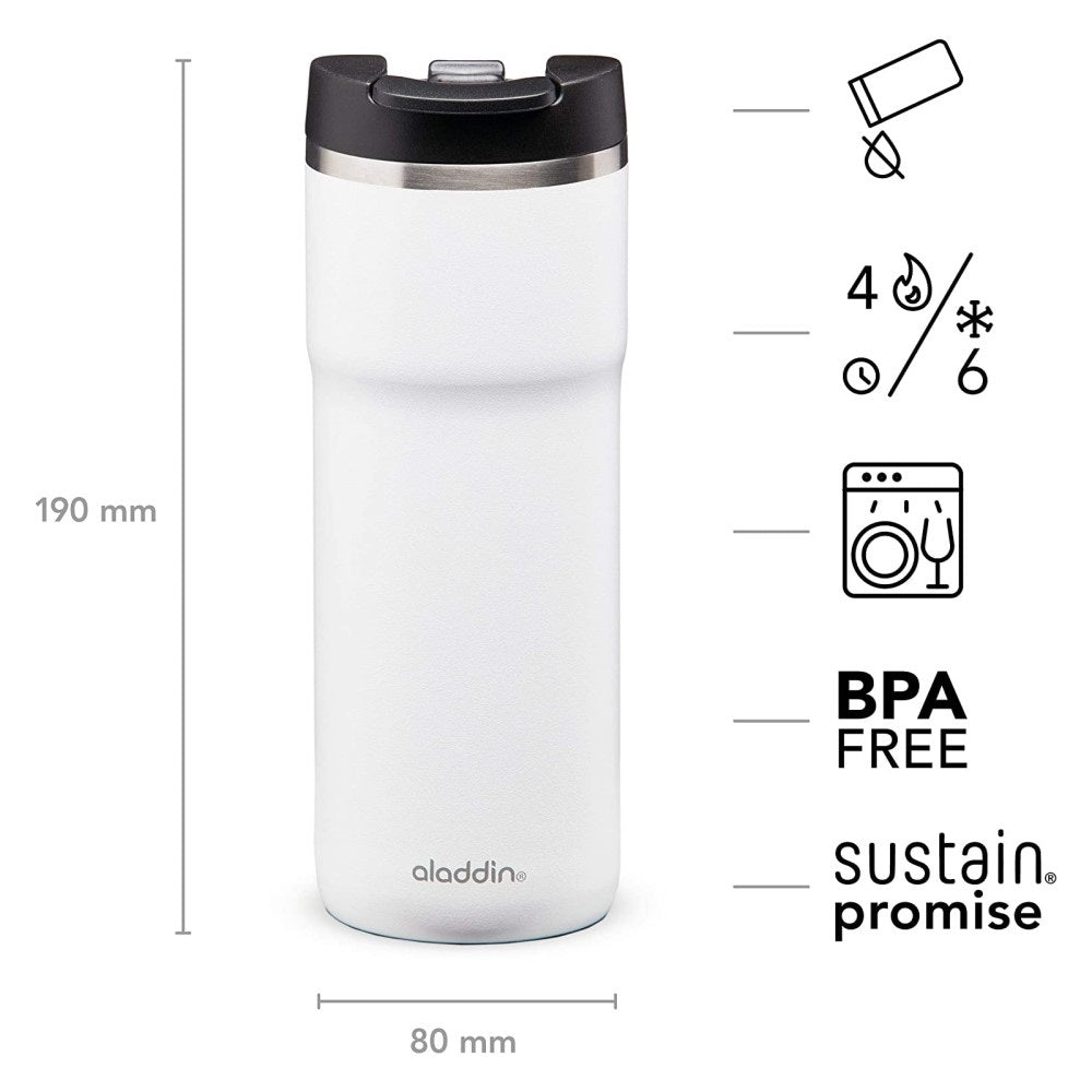 Aladdin Java Thermavac çift duvar vakumlu paslanmaz çelik yapısıyla içeceklerinizi uzun süre sıcak veya soğuk tutar Leak-Lock™ teknolojisi sayesinde %100 sızdırmaz kapak ve güvenli kilitleme mekanizmasıyla sızıntı yapmaz kompakt tasarımı sayesinde çoğu ofis ve ev tipi kahve makinesinin altına rahatça sığar cilalı çelik şeridi sayesinde kapağı olmadan bardak olarak da kullanılabilir dayanıklı kaplama ve kolay kavrama özelliği günlük kullanımda konfor sağlar BPA içermez ve bulaşık makinesinde yıkanabilir