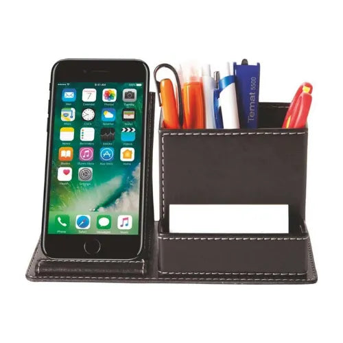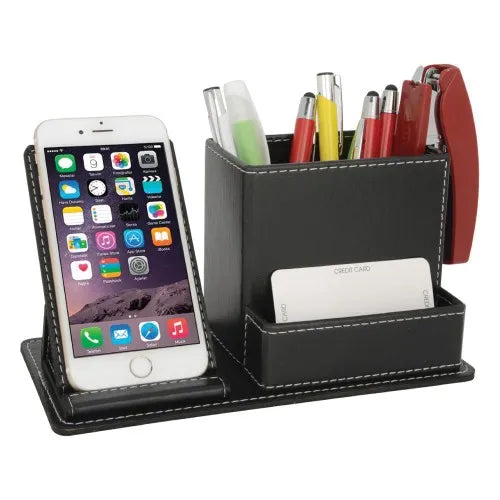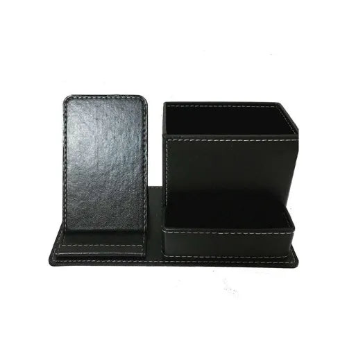 Şıklık ve fonksiyonelliği bir arada sunan suni deri kalemlik masa üzeri düzeninizi kusursuz hale getirir kartvizit ve cep telefonu için özel bölmeleri ile hem ofisinizde hem toplantılarınızda pratik kullanım sağlar