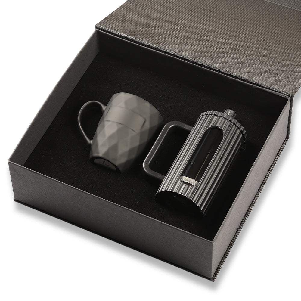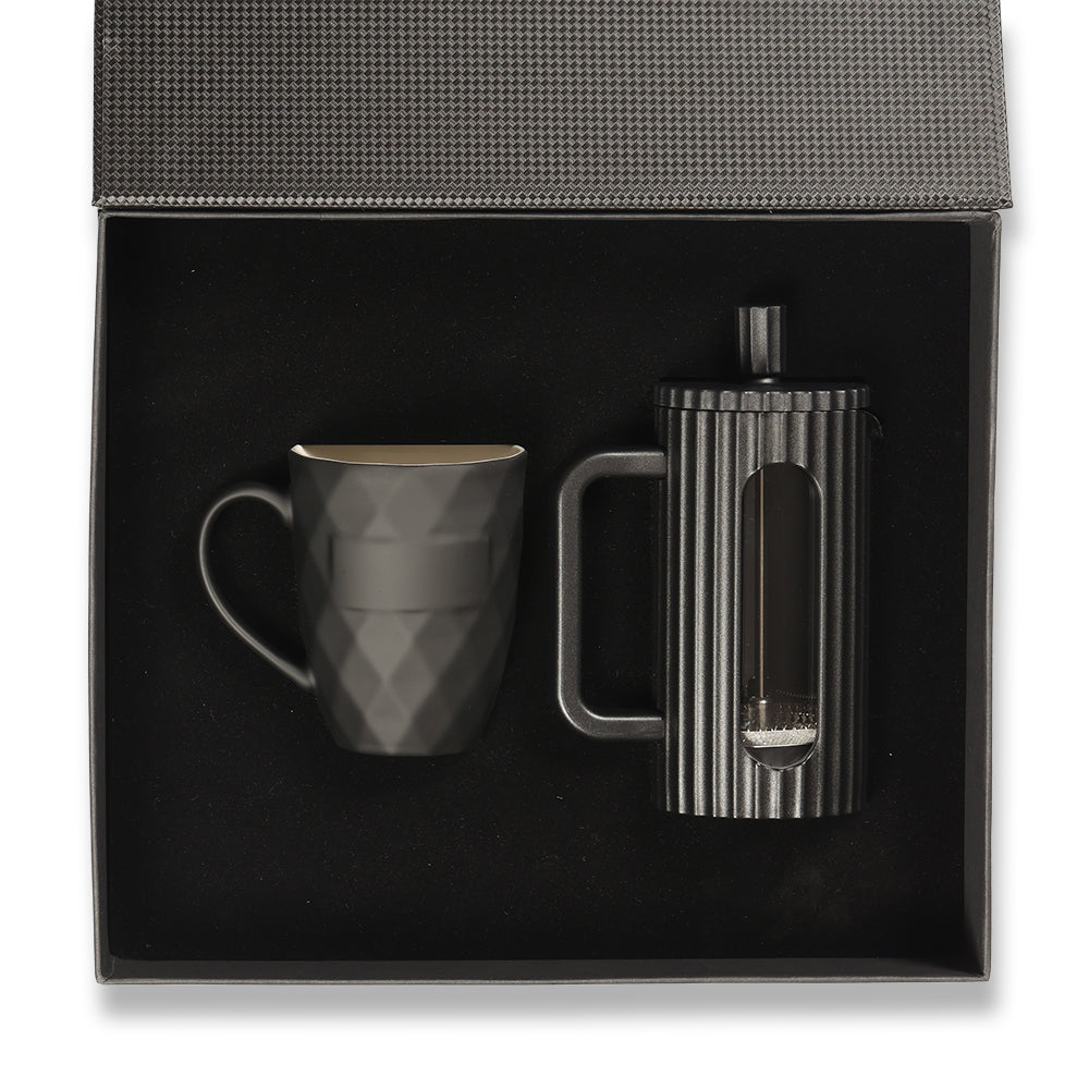 Kahve tutkunları için özenle tasarlanan bu set, modern ofis ve ev kullanımı için mükemmel bir tercihtir. 350 ml siyah French Press ve şık Diamond porselen bardak, markanızı zarafet ve keyifli bir deneyimle buluşturur.